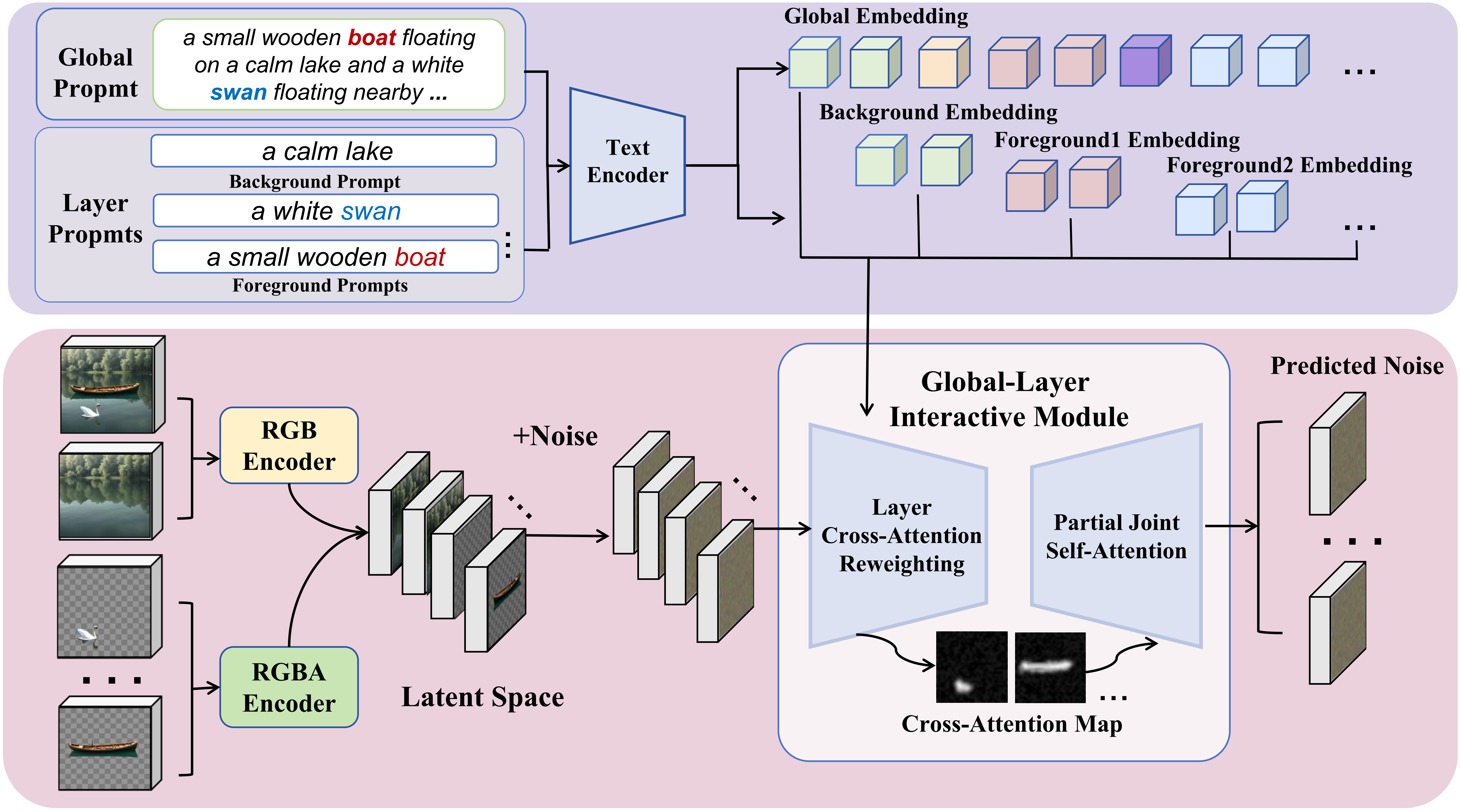 Overview of our global-layer interactive mechanism, composed of layer cross-attention reweighting module and partial joint self-attention module. Layer cross-attention reweighting module extracts the cross-attention map from the global branch to reweight the cross-attention map of the layer branch, guiding the position of foreground layers. Partial joint self-attention module implements a shared attention across global branch and layer branch to facilitate context-aware feature modeling.