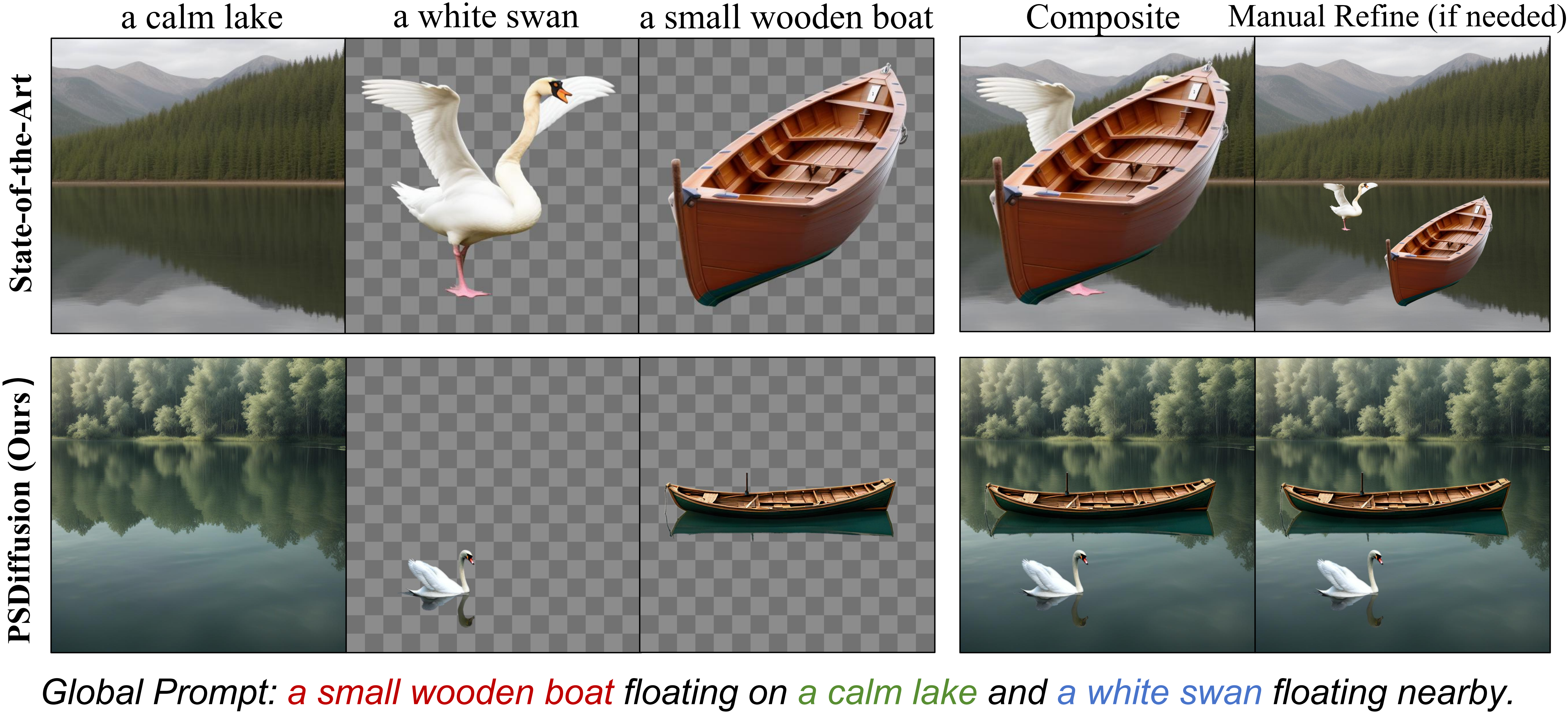 To address this issue, we propose PSDiffusion, a unified diffusion framework that leverages image composition priors from pre-trained image diffusion model for simultaneous multi-layer text-to-image generation. Specifically, our method introduces a global layer interaction mechanism to generate layered images collaboratively, ensuring both individual layer quality and coherent spatial and visual relationships across layers.